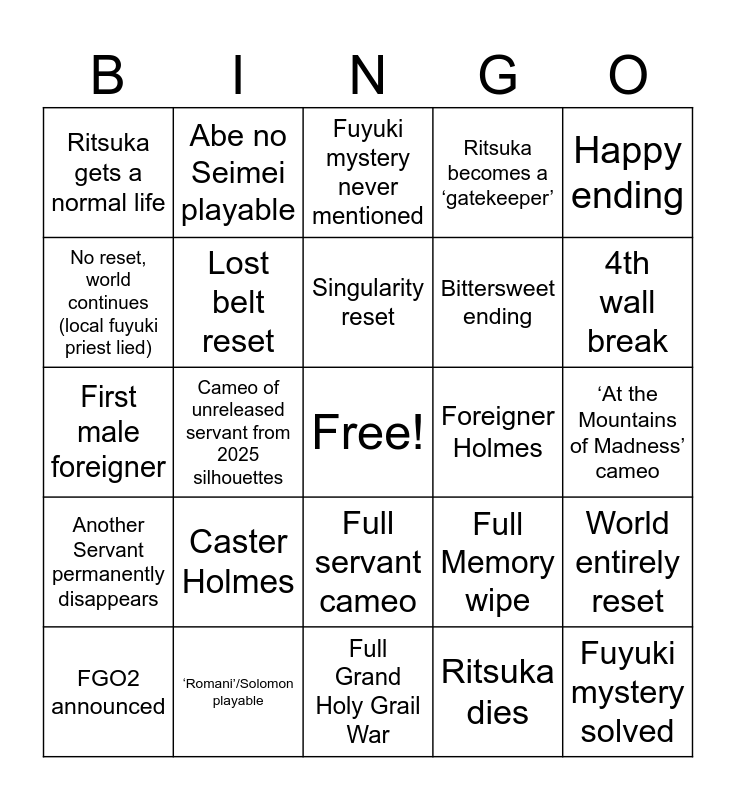 This bingo card has a free space and 24 words: Caster Holmes, ‘Romani’/Solomon playable, Singularity reset, FGO2 announced, Happy ending, Ritsuka gets a normal life, No reset, world continues (local fuyuki priest lied), Abe no Seimei playable, Foreigner Holmes, Full servant cameo, Bittersweet ending, First male foreigner, Full Memory wipe, World entirely reset, Lost belt reset, Ritsuka dies, ‘At the Mountains of Madness’ cameo, Fuyuki mystery never mentioned, 4th wall break, Cameo of unreleased servant from 2025 silhouettes, Fuyuki mystery solved, Another Servant permanently disappears, Ritsuka becomes a ‘gatekeeper’ and Full Grand Holy Grail War.