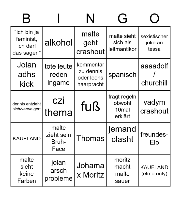 This bingo card has a free space and 24 words: malte sieht keine Farben, malte zieht sein Bruh-Face, kommentar zu dennis oder leons haarpracht, moritz macht malte sauer, sexistischer joke an tessa, "ich bin ja feminist, ich darf das sagen", alkohol, malte geht crashout, fragt regeln obwohl 10mal erklärt, vadym crashout, dennis entzieht sich/verweigert, tote leute reden ingame, jemand clasht, freundes-Elo, Jolan adhs kick, jolan arsch probleme, Johama x Moritz, malte sieht sich als leitmantikor, aaaadolf / churchill, KAUFLAND, czi thema, Thomas, spanisch and KAUFLAND (elmo only).