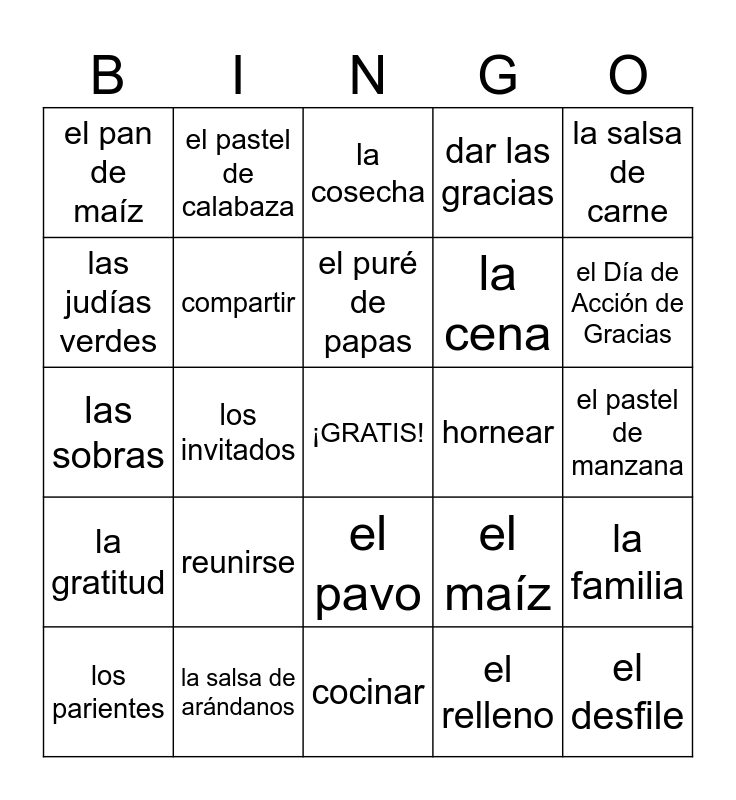 This bingo card has a free space and 26 words: el pavo, el relleno, el puré de papas, la salsa de arándanos, la salsa de carne, el pan de maíz, las judías verdes, el pastel de calabaza, el pastel de manzana, el maíz, la cena, las sobras, la familia, los parientes, los invitados, agradecer, dar las gracias, la gratitud, la cosecha, el desfile, el Día de Acción de Gracias, cocinar, hornear, reunirse, compartir and celebrar.