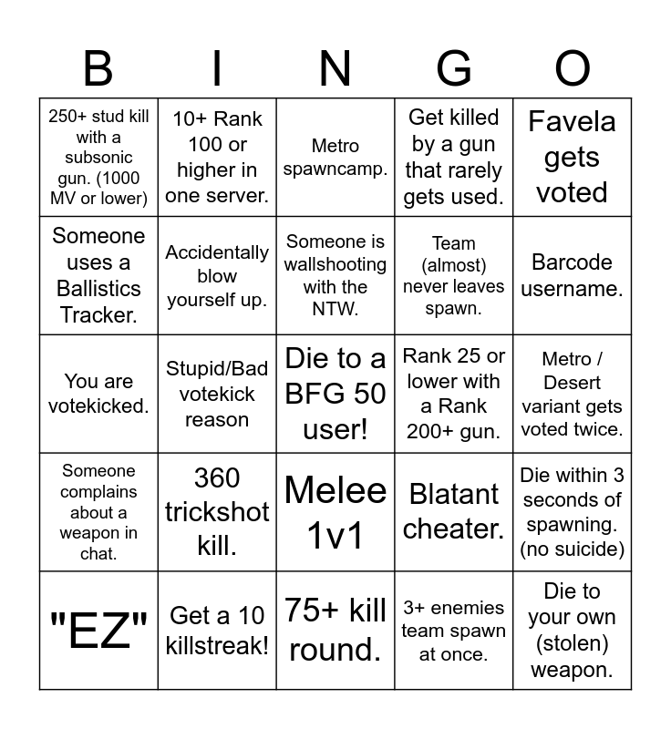 This bingo card has a free space and 24 words: 360 trickshot kill., Get a 10 killstreak!, Someone is wallshooting with the NTW., "EZ", Favela gets voted, 250+ stud kill with a subsonic gun. (1000 MV or lower), Someone uses a Ballistics Tracker., 10+ Rank 100 or higher in one server., Rank 25 or lower with a Rank 200+ gun., Melee 1v1, Team (almost) never leaves spawn., You are votekicked., Blatant cheater., Die within 3 seconds of spawning. (no suicide), Accidentally blow yourself up., 3+ enemies team spawn at once., Metro / Desert variant gets voted twice., Metro spawncamp., Barcode username., Stupid/Bad votekick reason, Die to your own (stolen) weapon., Someone complains about a weapon in chat., Get killed by a gun that rarely gets used. and 75+ kill round..