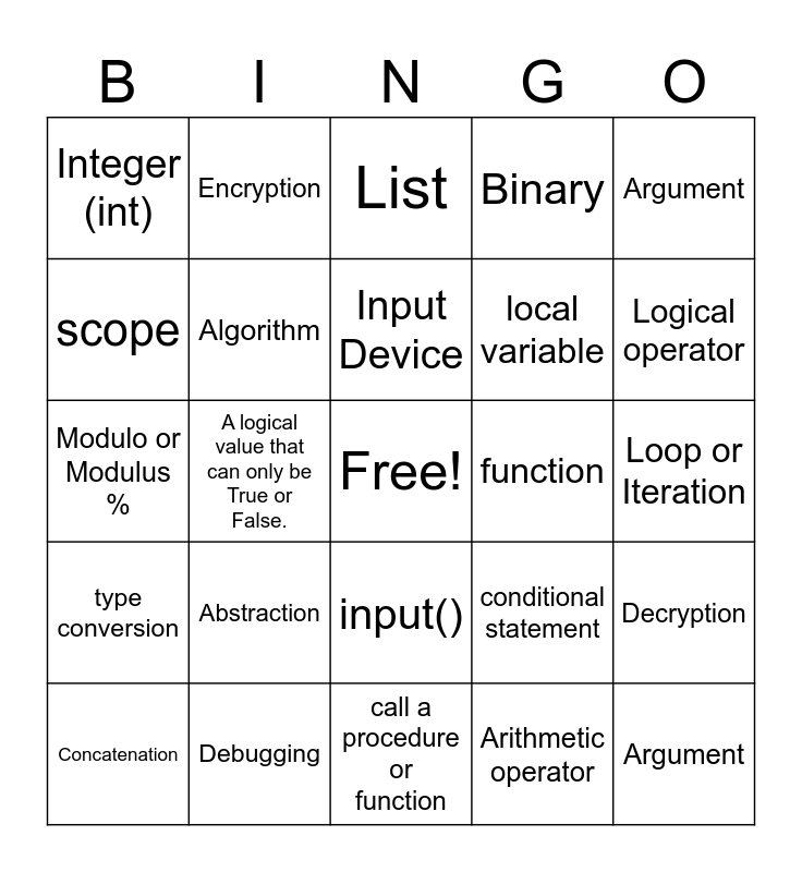 This bingo card has a free space and 29 words: Concatenation, string, A logical value that can only be True or False., Float (float), Integer (int), List, Algorithm, Abstraction, function, Debugging, Loop or Iteration, Argument, call a procedure or function, Arithmetic operator, Logical operator, Application Programming Interfaces (API), input(), type conversion, Argument, Modulo or Modulus %, conditional statement, global variable, local variable, scope, Binary, Encryption, Decryption, Input Device and Output Device.