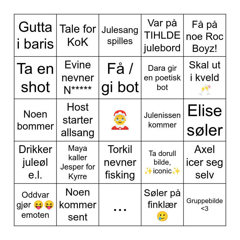 This bingo card has a free space and 24 words: Maya kaller Jesper for Kyrre, Noen kommer sent, Få / gi bot, Oddvar gjør 😝😝 emoten, Få på noe Roc Boyz!, Gutta i baris, Ta en shot, Tale for KoK, Julenissen kommer, Torkil nevner fisking, Dara gir en poetisk bot, Noen bommer, Ta dorull bilde, ✨iconic✨, Axel icer seg selv, Evine nevner N*****, Søler på finklær 🥲, Elise søler, Julesang spilles, Skal ut i kveld🥂, Host starter allsang, Gruppebilde <3, Drikker juleøl e.l., Var på TIHLDE julebord and ....