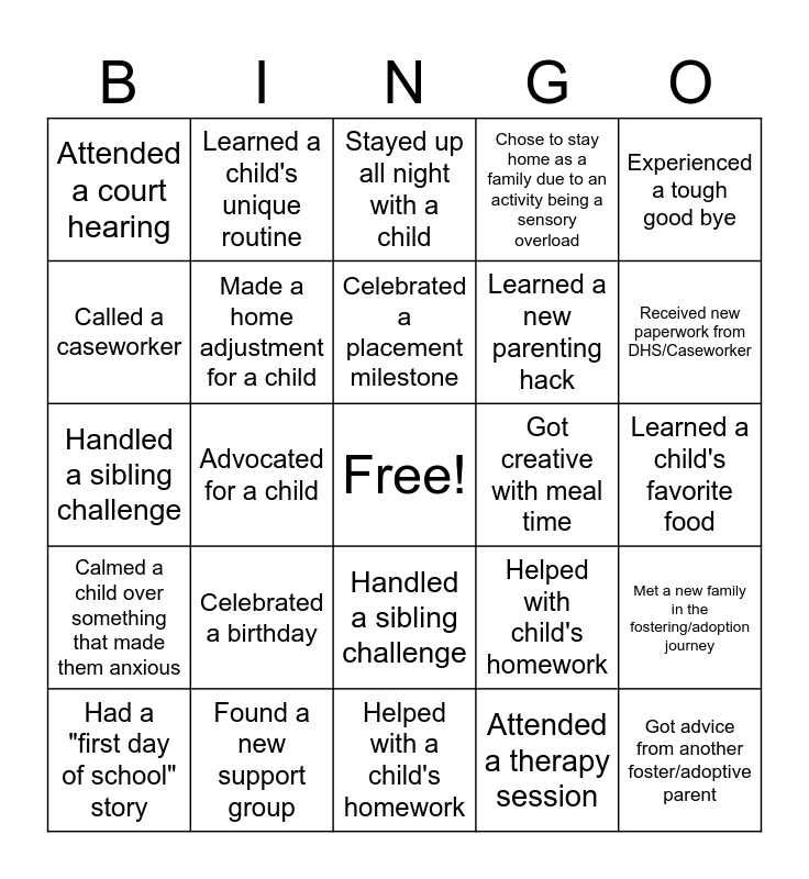 This bingo card has a free space and 24 words: Celebrated a birthday, Found a new support group, Celebrated a placement milestone, Had a "first day of school" story, Experienced a tough good bye, Attended a court hearing, Called a caseworker, Learned a child's unique routine, Got creative with meal time, Handled a sibling challenge, Learned a new parenting hack, Handled a sibling challenge, Helped with child's homework, Met a new family in the fostering/adoption journey, Made a home adjustment for a child, Attended a therapy session, Learned a child's favorite food, Stayed up all night with a child, Received new paperwork from DHS/Caseworker, Advocated for a child, Got advice from another foster/adoptive parent, Calmed a child over something that made them anxious, Chose to stay home as a family due to an activity being a sensory overload and Helped with a child's homework.