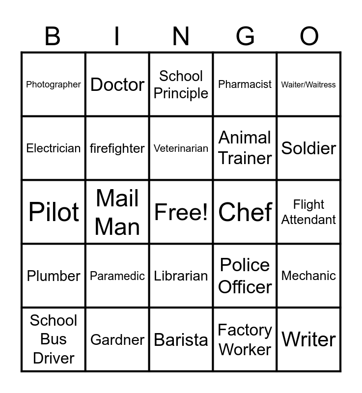 This bingo card has a free space and 39 words: Teacher, Delivery Person, Judge, Police Officer, Mechanic, Plumber, Mail Man, Lawyer, Chef, Flight Attendant, Electrician, Doctor, Dentist, Soldier, Pilot, Paramedic, Librarian, Pharmacist, Farmer, School Bus Driver, firefighter, Veterinarian, Factory Worker, Waiter/Waitress, Carpenter, Gardner, Barista, Locksmith, Actor, Photographer, Air Traffic Control, Taxi Driver, Animal Trainer, Writer, Musician, Scientist, School Principle, Nurse and Janitor.