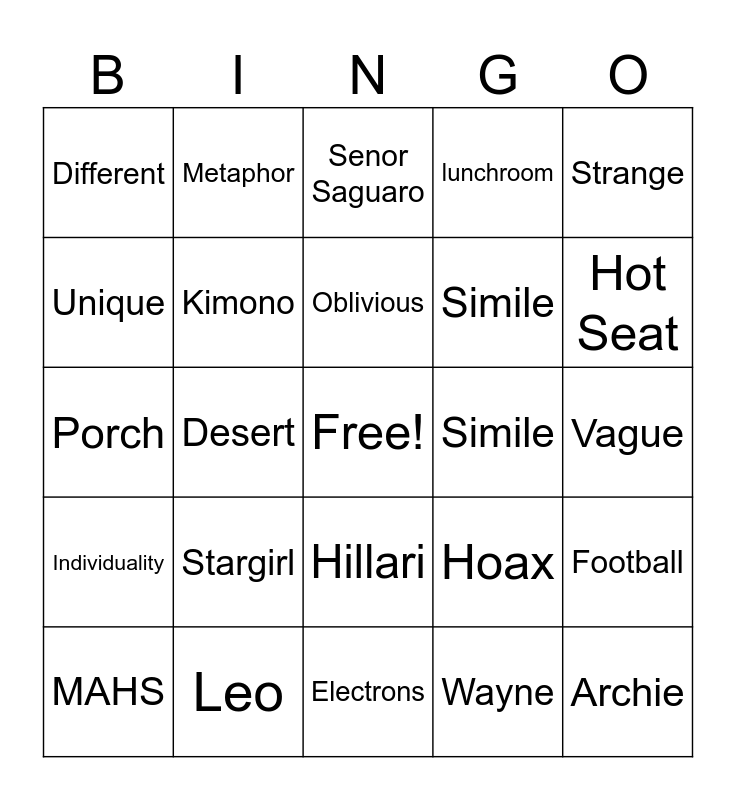 This bingo card has a free space and 24 words: Stargirl, Leo, Oblivious, MAHS, Strange, Different, Unique, Metaphor, Simile, Hillari, Simile, Porch, Hoax, Football, Kimono, Wayne, Vague, Senor Saguaro, Hot Seat, Desert, Archie, Individuality, lunchroom and Electrons.