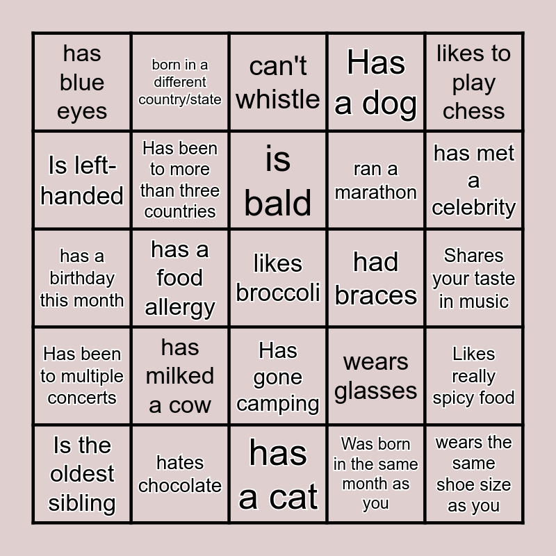 This bingo card has a free space and 34 words: can't ride a bike, doesn't drink coffee or tea, Is an only child, Can an instruments, Shares your taste in music, Is left-handed, Has been to more than three countries, has a cat, ran a marathon, wears the same shoe size as you, has a birthday this month, born in a different country/state, Was born in the same month as you, Has met someone famous, Has been to multiple concerts, has a food allergy, Has gone camping, had braces, Likes really spicy food, Is the oldest sibling, hates chocolate, Has glasses, Has a dog, has met a celebrity, is wearing jewelry, has milked a cow, can't whistle, played a team sport, likes to play chess, has blue eyes, has curly hair, is bald, wears glasses and is wearing a watch.