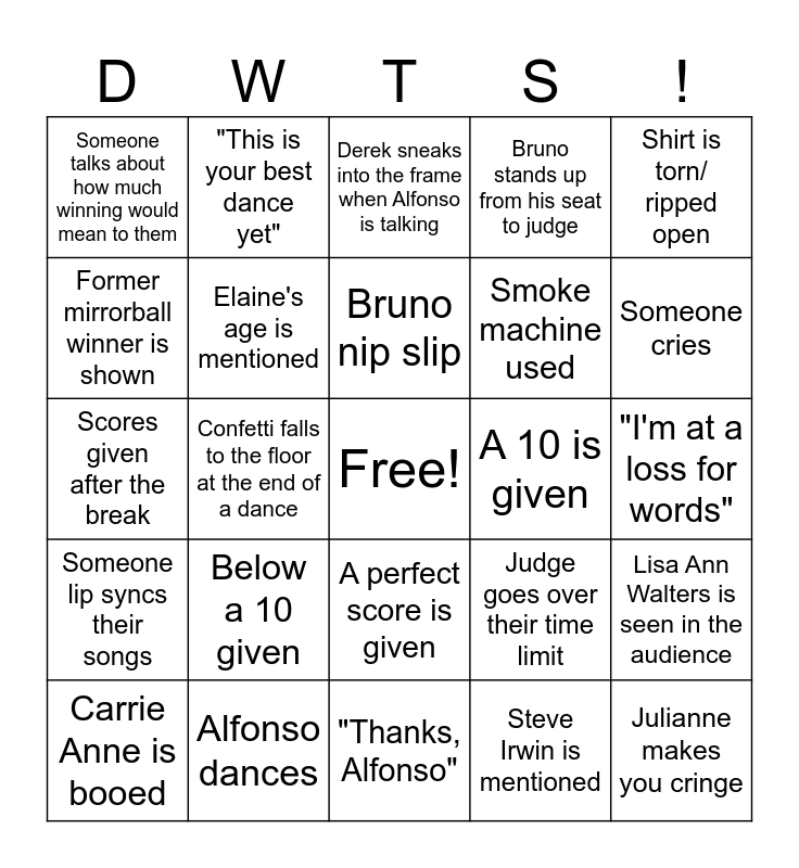 This bingo card has a free space and 43 words: Alfonso tells a lame joke, Julianne makes you cringe, Bruno wags his finger, Carrie Anne is booed, DWTS Tour is mentioned, Steve Irwin is mentioned, Derek sneaks into the frame when Alfonso is talking, Derek says "my man" or "my love", Shirt is torn/ ripped open, Alfonso dances, Bruno stands up from his seat to judge, A 10 is given, A perfect score is given, Below a 10 given, Standing ovation comment from Alfonso, "Thanks, Alfonso", "Aww thanks, Julianne", Scores given after the break, Len is mentioned, Someone cries, "This is your best dance yet", "I didn't think I'd make it this far", Carrie Ann makes you cringe, Someone talks about how much winning would mean to them, "What a way to start the finale", "I'm at a loss for words", Bruno says "my darling", Podcast gets mentioned, Judge goes over their time limit, Someone lip syncs their songs, Zac Efron is in the audience, Lisa Ann Walters is seen in the audience, Julianne costume change, Confetti falls to the floor at the end of a dance, "Fabulous darling", Someone in the cast says that this is a family, Andy Richter makes an appearance, Bruno nip slip, Former mirrorball winner is shown, Smoke machine used, Robert Irwin cries, Elaine's age is mentioned and Jordan does a gymnastic move in her dance.