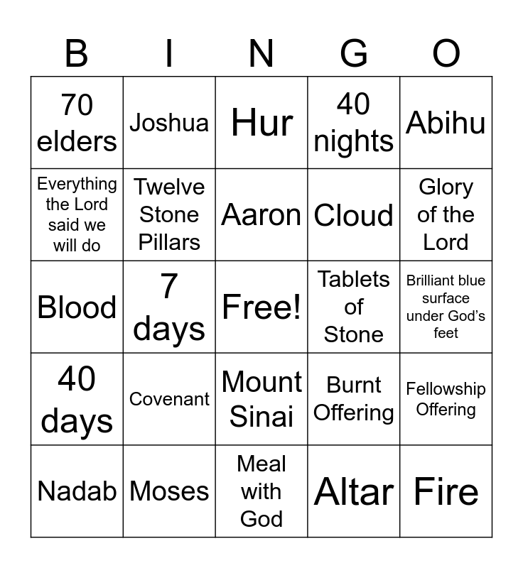 This bingo card has a free space and 24 words: Covenant, Moses, Aaron, Nadab, Abihu, 70 elders, Everything the Lord said we will do, Joshua, Tablets of Stone, Mount Sinai, Cloud, Blood, Burnt Offering, Fellowship Offering, Twelve Stone Pillars, Altar, Brilliant blue surface under God’s feet, Hur, Glory of the Lord, 7 days, Fire, 40 days, 40 nights and Meal with God.