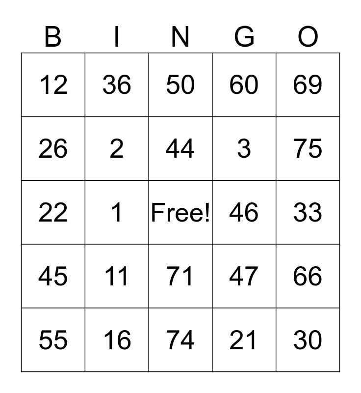 This bingo card has a free space and 24 words: 11, 16, 44, 55, 69, 12, 26, 36, 46, 71, 3, 22, 47, 66, 2, 21, 33, 50, 75, 1, 30, 45, 60 and 74.