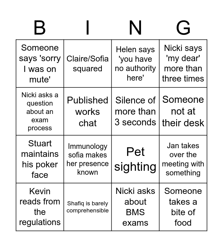 This bingo card has 16 words: Shafiq is barely comprehensible, Jan takes over the meeting with something, Helen says 'you have no authority here', Someone says 'sorry I was on mute', Stuart maintains his poker face, Claire/Sofia squared, Pet sighting, Nicki asks about BMS exams, Nicki asks a question about an exam process, Published works chat, Kevin reads from the regulations, Nicki says 'my dear' more than three times, Immunology sofia makes her presence known, Someone not at their desk, Silence of more than 3 seconds and Someone takes a bite of food.