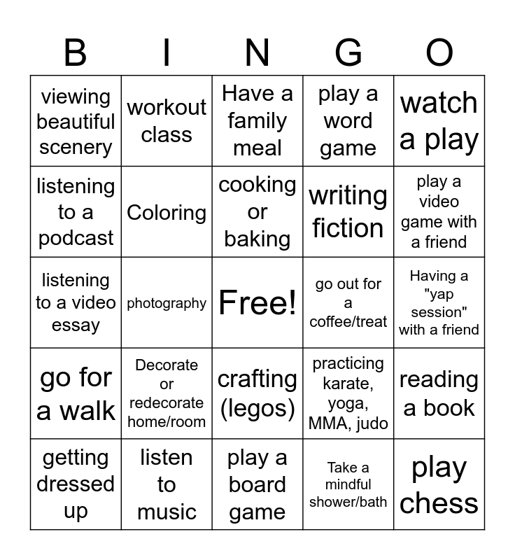 This bingo card has a free space and 24 words: Decorate or redecorate home/room, listen to music, cooking or baking, getting dressed up, watch a play, viewing beautiful scenery, listening to a podcast, workout class, go out for a coffee/treat, crafting (legos), writing fiction, listening to a video essay, practicing karate, yoga, MMA, judo, reading a book, Coloring, Take a mindful shower/bath, Having a "yap session" with a friend, Have a family meal, play a video game with a friend, photography, play chess, go for a walk, play a word game and play a board game.