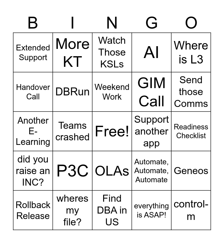 This bingo card has a free space and 25 words: P3C, Find DBA in US, Weekend Work, Rollback Release, Where is L3, Extended Support, Handover Call, More KT, Support another app, OLAs, GIM Call, Another E-Learning, Automate, Automate, Automate, Geneos, DBRun, What Budget?, Readiness Checklist, Watch Those KSLs, Send those Comms, Teams crashed, control-m, wheres my file?, did you raise an INC?, AI and everything is ASAP!.
