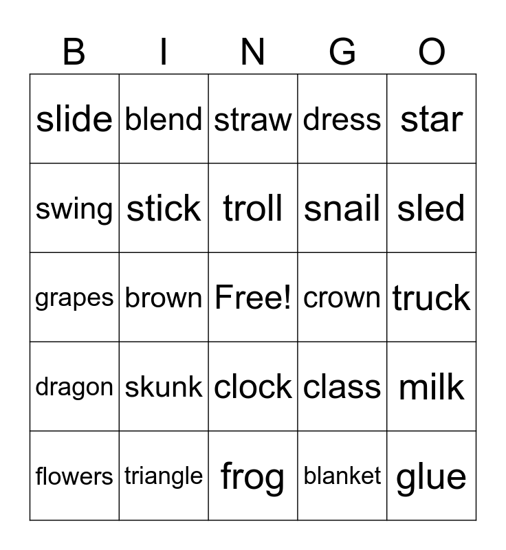 This bingo card has a free space and 32 words: blanket, green, brown, black, dragon, stick, star, milk, blend, tree, troll, straw, twin, trunk, crown, raft, flowers, grapes, clock, skunk, class, crab, truck, triangle, glue, dress, snail, swing, slide, frog, drink and sled.