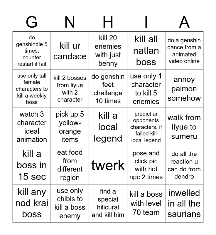 This bingo card has a free space and 24 words: eat food from different region, use only chibis to kill a boss enemy, do genshin feet challenge 10 times, kill any nod krai boss, do a genshin dance from a animated video online, do genshindle 5 times, counter restart if fail, use only tall female characters to kill a weekly boss, kill ur candace, predict ur opponents characters, if failed kill local legend, twerk, use only 1 character to kill 5 enemies, watch 3 character ideal animation, pose and click pic with hot npc 2 times, do all the reaction u can do from dendro, kill 2 bosses from liyue with 2 character, kill a boss with level 70 team, walk from liyue to sumeru, kill 20 enemies with just benny, annoy paimon somehow, pick up 5 yellow-orange items, inwelled in all the saurians, kill a boss in 15 sec, kill all natlan boss and find a special hilicural and kill him.