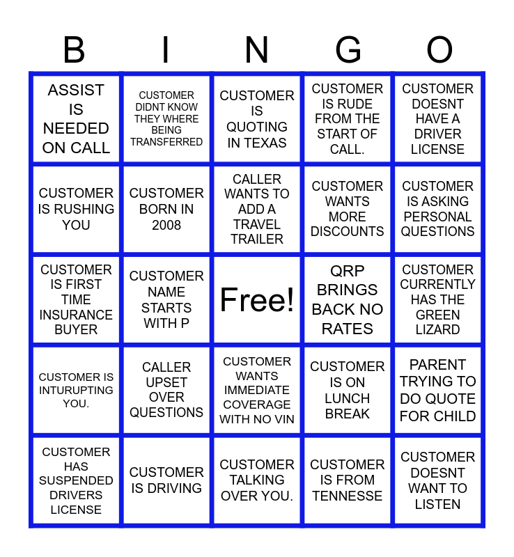 This bingo card has a free space and 24 words: CALLER UPSET OVER QUESTIONS, CUSTOMER IS DRIVING, CALLER WANTS TO ADD A TRAVEL TRAILER, CUSTOMER HAS SUSPENDED DRIVERS LICENSE, CUSTOMER DOESNT HAVE A DRIVER LICENSE, ASSIST IS NEEDED ON CALL, CUSTOMER IS RUSHING YOU, CUSTOMER DIDNT KNOW THEY WHERE BEING TRANSFERRED, QRP BRINGS BACK NO RATES, CUSTOMER WANTS IMMEDIATE COVERAGE WITH NO VIN, CUSTOMER WANTS MORE DISCOUNTS, CUSTOMER IS FIRST TIME INSURANCE BUYER, CUSTOMER IS ON LUNCH BREAK, PARENT TRYING TO DO QUOTE FOR CHILD, CUSTOMER BORN IN 2008, CUSTOMER IS FROM TENNESSE, CUSTOMER CURRENTLY HAS THE GREEN LIZARD, CUSTOMER IS QUOTING IN TEXAS, CUSTOMER IS ASKING PERSONAL QUESTIONS, CUSTOMER NAME STARTS WITH P, CUSTOMER DOESNT WANT TO LISTEN, CUSTOMER IS INTURUPTING YOU., CUSTOMER IS RUDE FROM THE START OF CALL. and CUSTOMER TALKING OVER YOU..