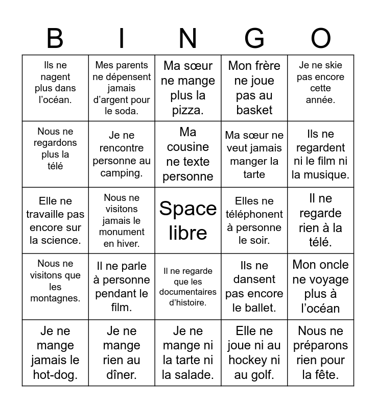 This bingo card has a free space and 29 words: Je ne mange jamais le hot-dog., Elle ne regarde jamais la télé avec sa famille., Nous ne visitons jamais le monument en hiver., Je ne joue plus au basket., Ils ne nagent plus dans l’océan., Ma sœur ne mange plus la pizza., Je ne rencontre personne au camping., Il ne parle à personne pendant le film., Elles ne téléphonent à personne le soir., Je ne mange rien au dîner., Il ne regarde rien à la télé., Nous ne préparons rien pour la fête., Je ne mange ni la tarte ni la salade., Elle ne joue ni au hockey ni au golf., Ils ne regardent ni le film ni la musique., Je ne mange que les bananes., Il ne regarde que les documentaires d’histoire., Nous ne visitons que les montagnes., Je ne skie pas encore cette année., Elle ne travaille pas encore sur la science., Ils ne dansent pas encore le ballet., Je n’ai rien envie de magasiner., Ma sœur ne veut jamais manger la tarte, Nous ne regardons plus la télé, Mon frère ne joue pas au basket, Mes parents ne dépensent jamais d’argent pour le soda., Mon oncle ne voyage plus à l’océan, Ma cousine ne texte personne and Mon père ne magasine jamais pour les bananes.