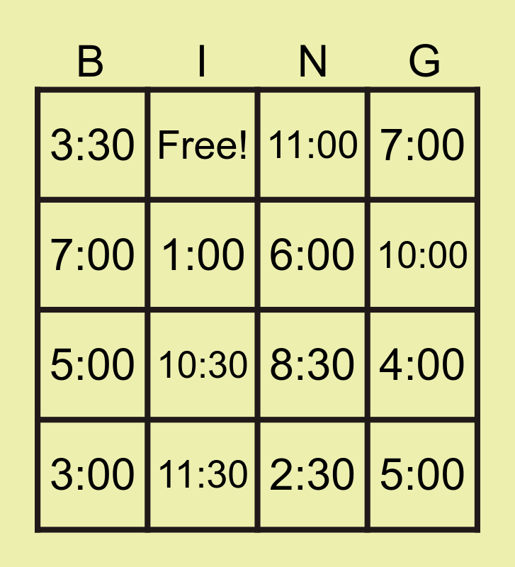 This bingo card has 34 words: 1:00, 2:00, 3:00, 4:00, 5:00, 6:00, 7:00, 8:00, Free!, 9:00, 10:00, 11:00, 12:00, 12:30, 11:30, 10:30, 9:30, 8:30, 7:30, 6:30, 5:30, 4:30, 3:30, 2:30, 1:30, 3:00, 7:00, 2:00, 5:00, 1:00, 12:00, 4:00, 6:00 and 1100.