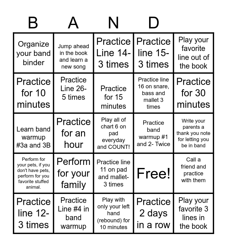 This bingo card has 25 words: Perform for your family, Play with only your left hand (rebound) for 10 minutes, Practice for 15 minutes, Practice line 12- 3 times, Play your favorite line out of the book, Organize your band binder, Practice for 10 minutes, Jump ahead in the book and learn a new song, Practice band warmup #1 and 2- Twice, Practice line 11 on pad and mallet- 3 times, Practice line 16 on snare, bass and mallet 3 times, Learn band warmup #3a and 3B, Free!, Call a friend and practice with them, Practice Line 26- 5 times, Play your favorite 3 lines in the book, Write your parents a thank you note for letting you be in band, Practice Line 14- 3 times, Practice for 30 minutes, Practice for an hour, Play all of chart 6 on pad everyday and COUNT!, Practice Line #4 in band warmup, Perform for your pets, if you don't have pets, perform for you favorite stuffed animal., Practice line 15- 3 times and Practice 2 days in a row.