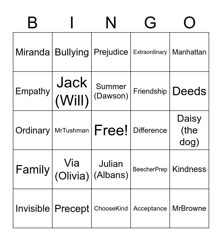 This bingo card has a free space and 28 words: Kindness, Courage, Friendship, Acceptance, Empathy, Prejudice, Bullying, Family, Difference, Invisible, Ordinary, Extraordinary, Precept, ChooseKind, Deeds, August (Auggie), Via (Olivia), Jack (Will), Summer (Dawson), Julian (Albans), Miranda, Justin, MrBrowne, MrTushman, Daisy (the dog), BeecherPrep, Manhattan and Broarwood.