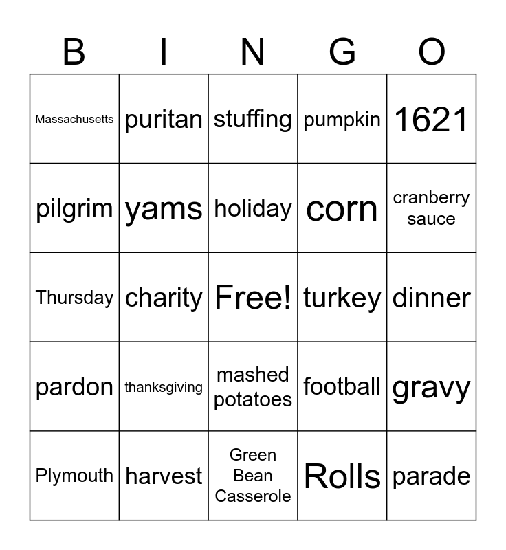 This bingo card has a free space and 24 words: thanksgiving, harvest, holiday, Plymouth, 1621, Massachusetts, pilgrim, puritan, turkey, mashed potatoes, corn, Thursday, football, gravy, yams, Rolls, dinner, stuffing, cranberry sauce, charity, parade, pardon, pumpkin and Green Bean Casserole.