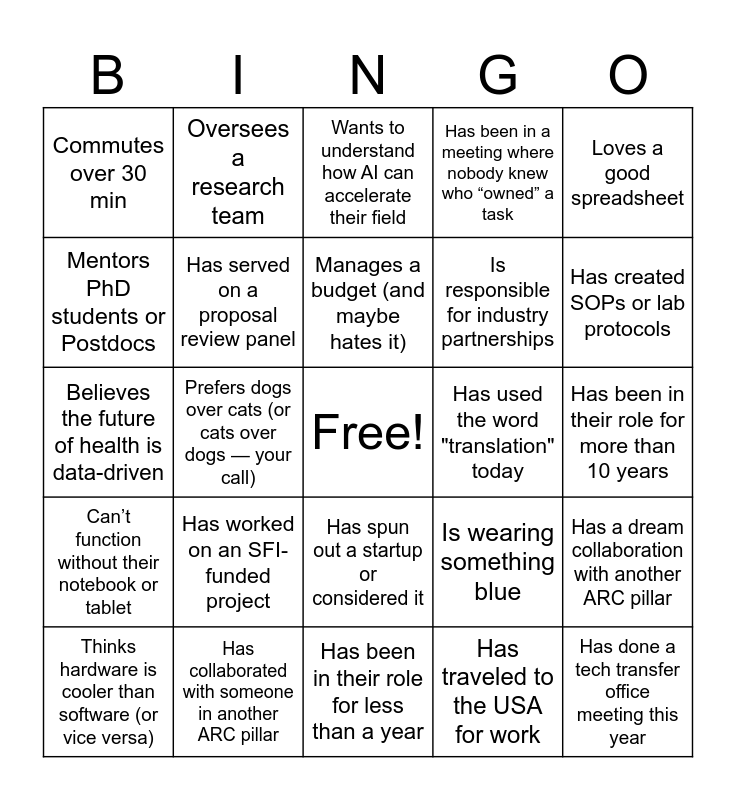 This bingo card has a free space and 24 words: Has worked on an SFI-funded project, Has collaborated with someone in another ARC pillar, Manages a budget (and maybe hates it), Thinks hardware is cooler than software (or vice versa), Loves a good spreadsheet, Commutes over 30 min, Mentors PhD students or Postdocs, Oversees a research team, Has used the word "translation" today, Has spun out a startup or considered it, Is responsible for industry partnerships, Believes the future of health is data-driven, Is wearing something blue, Has a dream collaboration with another ARC pillar, Has served on a proposal review panel, Has traveled to the USA for work, Has been in their role for more than 10 years, Wants to understand how AI can accelerate their field, Has created SOPs or lab protocols, Prefers dogs over cats (or cats over dogs — your call), Has done a tech transfer office meeting this year, Can’t function without their notebook or tablet, Has been in a meeting where nobody knew who “owned” a task and Has been in their role for less than a year.
