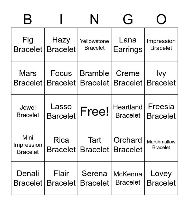 This bingo card has a free space and 24 words: Rica Bracelet, Flair Bracelet, Bramble Bracelet, Denali Bracelet, Impression Bracelet, Fig Bracelet, Mars Bracelet, Hazy Bracelet, Heartland Bracelet, Tart Bracelet, Creme Bracelet, Jewel Bracelet, Orchard Bracelet, Marshmallow Bracelet, Focus Bracelet, McKenna Bracelet, Freesia Bracelet, Yellowstone Bracelet, Ivy Bracelet, Lasso Barcelet, Lovey Bracelet, Mini Impression Bracelet, Lana Earrings and Serena Bracelet.