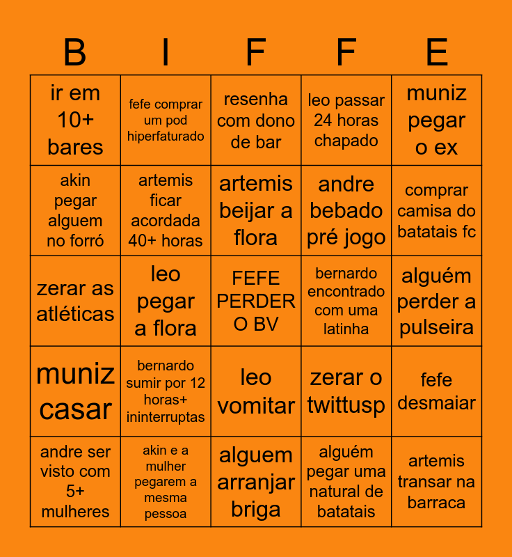 This bingo card has a free space and 24 words: bernardo sumir por 12 horas+ ininterruptas, akin e a mulher pegarem a mesma pessoa, artemis beijar a flora, andre ser visto com 5+ mulheres, muniz pegar o ex, ir em 10+ bares, akin pegar alguem no forró, fefe comprar um pod hiperfaturado, bernardo encontrado com uma latinha, leo vomitar, andre bebado pré jogo, zerar as atléticas, zerar o twittusp, fefe desmaiar, artemis ficar acordada 40+ horas, alguém pegar uma natural de batatais, alguém perder a pulseira, resenha com dono de bar, comprar camisa do batatais fc, leo pegar a flora, artemis transar na barraca, muniz casar, leo passar 24 horas chapado and alguem arranjar briga.