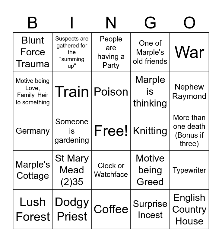 This bingo card has a free space and 39 words: Tea, Alkohol, Bus, Train, Lush Forest, Clock or Watchface, Poison, Taxi (Bonus if Inch), War, Marple's Cottage, Someone is gardening, One of Marple's old friends, English Country House, More than one death (Bonus if three), Knitting, St Mary Mead (2)35, In Church, Blunt Force Trauma, India, Motive being Greed, Motive being Love, Family, Heir to something, Coffee, Marple is thinking, Nephew Raymond, Told off by police for helping, America, Marple puts her Handbag down, Hotel, Restaurant, Suspects are gathered for the "summing up", Marple recalls s.o. from St Mary Mead, Stylish Hat, People are having a Party, Dodgy Priest, Surprise Incest, One of Marple's "Girls", Typewriter, Germany and The Sea.