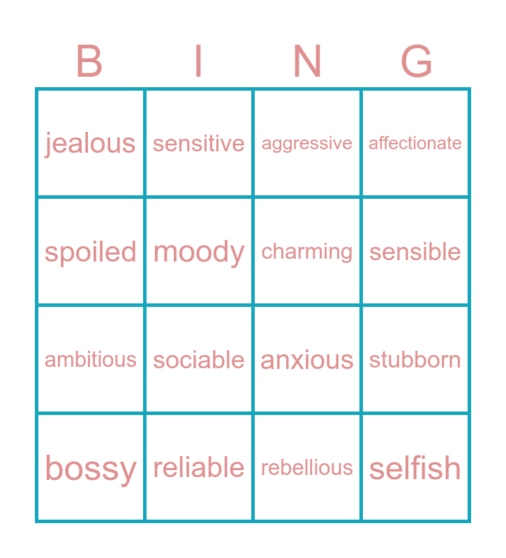 This bingo card has 16 words: reliable, stubborn, aggressive, jealous, ambitious, sensitive, anxious, rebellious, spoiled, moody, bossy, affectionate, sociable, sensible, charming and selfish.