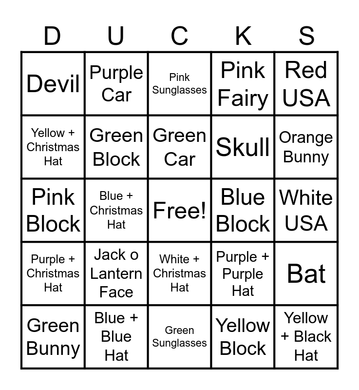 This bingo card has a free space and 64 words: Eyepatch, Pirate Hat, Ghost, Bat, Mummy, Blue Car, Purple Car, Brown Car, Green Car, Red Car, White + Christmas Hat, Blue USA, White USA, Red USA, Green + Christmas Hat, Yellow + Christmas Hat, Blue + Christmas Hat, Devil, Pumpkin, Skull, Jack o Lantern Face, Purple + Christmas Hat, Pink Fairy, Blue Fairy, Green Fairy, Orange Fairy, Purple Fairy, Pink Egg Shell, Orange Egg Shell, Purple Egg Shell, Green Egg Shell, Blue Egg Shell, Pink Bunny, Purple Bunny, Orange Bunny, Green Bunny, Blue Bunny, Yellow Block, Purple Block, Green Block, Pink Block, Blue Block, Thumbs Up, White + Pink Hat, Green + Green Hat, Yellow + Black Hat, Blue + Blue Hat, Blue + Purple Hat, Purple + Purple Hat, Pink + Pink Hat, Red Sunglasses, Blue Sunglasses, Green Sunglasses, Purple Sunglasses, Yellow Sunglasses, White Sunglasses, Pink Sunglasses, Pink Glitter, Orange Glitter, White Glitter, Yellow Glitter, Blue Glitter, Purple Glitter and Green Glitter.
