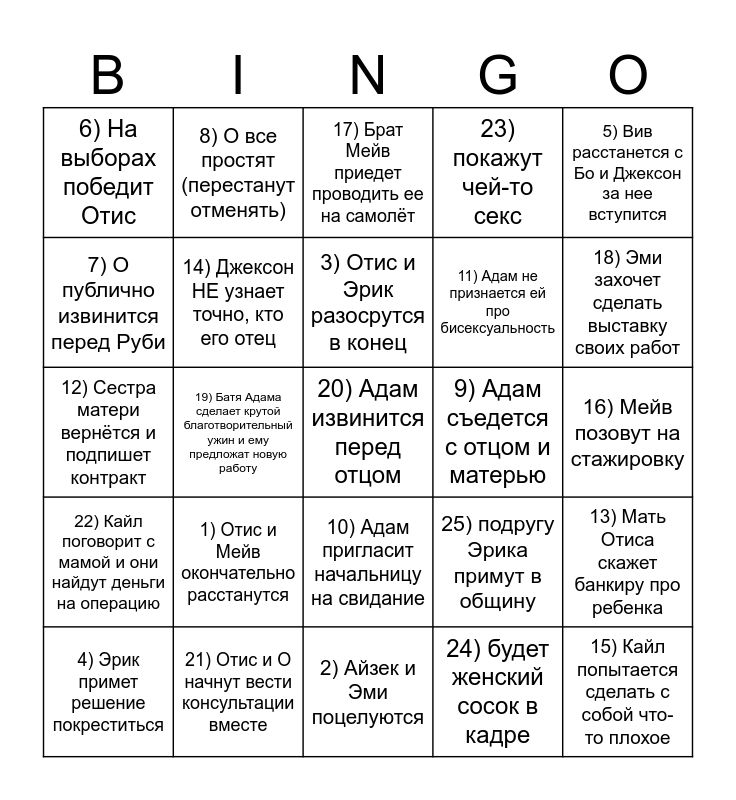 This bingo card has 25 words: 1) Отис и Мейв окончательно расстанутся, 2) Айзек и Эми поцелуются, 3) Отис и Эрик разосрутся в конец, 4) Эрик примет решение покреститься, 5) Вив расстанется с Бо и Джексон за нее вступится, 6) На выборах победит Отис, 7) О публично извинится перед Руби, 8) О все простят (перестанут отменять), 9) Адам съедется с отцом и матерью, 10) Адам пригласит начальницу на свидание, 11) Адам не признается ей про бисексуальность, 12) Сестра матери вернётся и подпишет контракт, 25) подругу Эрика примут в общину, 13) Мать Отиса скажет банкиру про ребенка, 14) Джексон НЕ узнает точно, кто его отец, 15) Кайл попытается сделать с собой что-то плохое, 16) Мейв позовут на стажировку, 17) Брат Мейв приедет проводить ее на самолёт, 18) Эми захочет сделать выставку своих работ, 19) Батя Адама сделает крутой благотворительный ужин и ему предложат новую работу, 20) Адам извинится перед отцом, 21) Отис и О начнут вести консультации вместе, 22) Кайл поговорит с мамой и они найдут деньги на операцию, 23) покажут чей-то секс and 24) будет женский сосок в кадре.