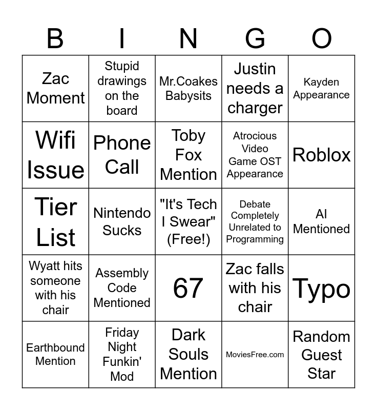 This bingo card has a free space and 24 words: Assembly Code Mentioned, Friday Night Funkin' Mod, Toby Fox Mention, Earthbound Mention, Kayden Appearance, Zac Moment, Wifi Issue, Stupid drawings on the board, Debate Completely Unrelated to Programming, 67, Atrocious Video Game OST Appearance, Tier List, Zac falls with his chair, Typo, Phone Call, MoviesFree.com, AI Mentioned, Mr.Coakes Babysits, Roblox, Nintendo Sucks, Random Guest Star, Wyatt hits someone with his chair, Justin needs a charger and Dark Souls Mention.