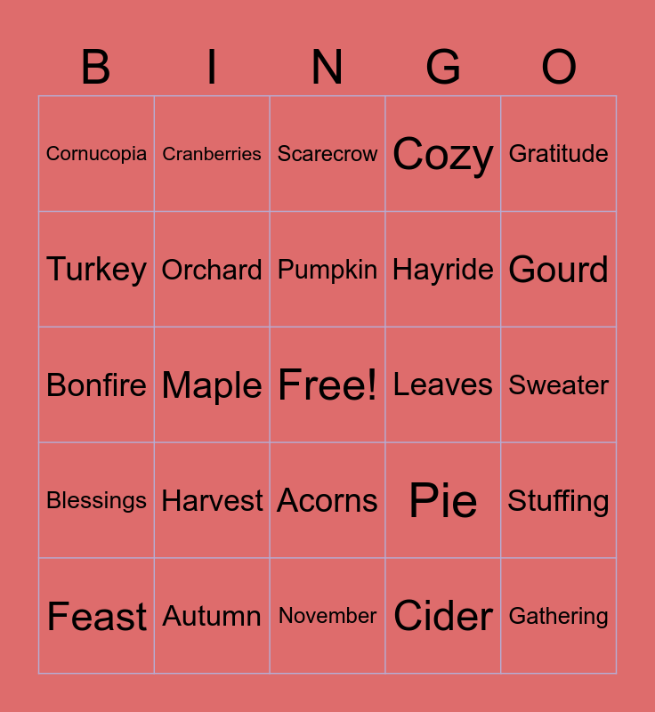This bingo card has a free space and 24 words: Harvest, Autumn, Pumpkin, Feast, Gratitude, Cornucopia, Turkey, Cranberries, Leaves, Acorns, Hayride, Bonfire, Pie, Stuffing, Orchard, Cider, Sweater, Scarecrow, Gourd, Maple, Gathering, Blessings, Cozy and November.