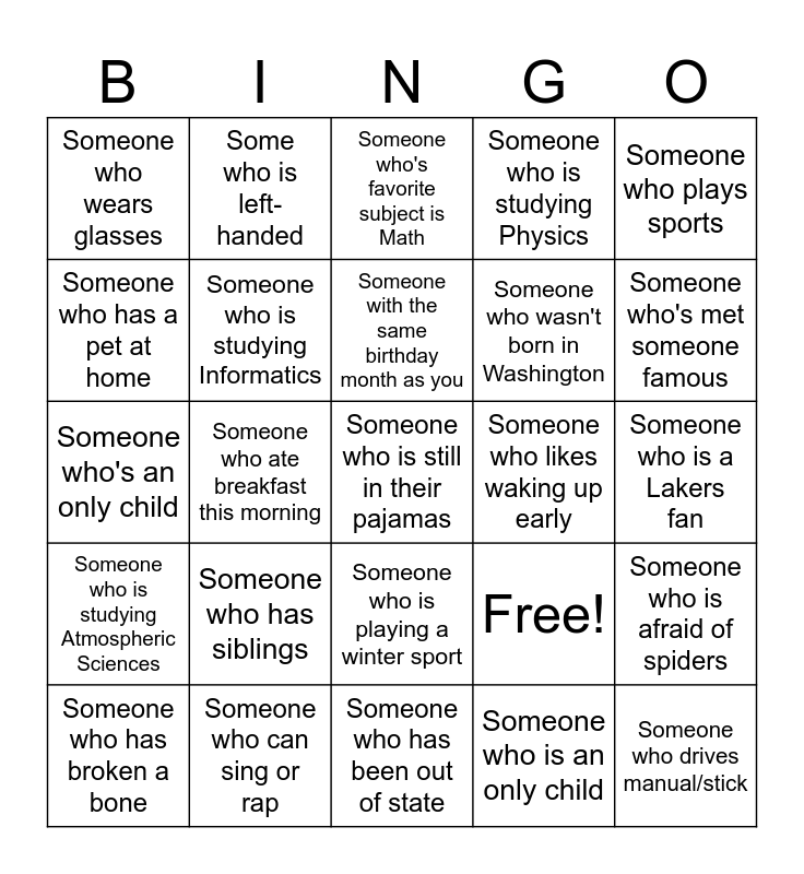 This bingo card has 25 words: Someone who has siblings, Someone who has been out of state, Someone with the same birthday month as you, Someone who has broken a bone, Someone who plays sports, Someone who wears glasses, Someone who has a pet at home, Some who is left-handed, Someone who likes waking up early, Someone who is playing a winter sport, Someone who wasn't born in Washington, Someone who's an only child, Free!, Someone who is afraid of spiders, Someone who is studying Informatics, Someone who drives manual/stick, Someone who is a Lakers fan, Someone who's favorite subject is Math, Someone who's met someone famous, Someone who ate breakfast this morning, Someone who is still in their pajamas, Someone who can sing or rap, Someone who is studying Atmospheric Sciences, Someone who is studying Physics and Someone who is an only child.