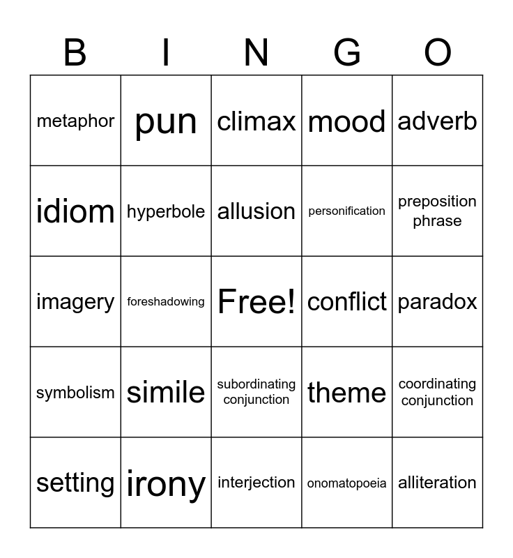 This bingo card has a free space and 24 words: simile, irony, allusion, setting, adverb, metaphor, idiom, pun, conflict, subordinating conjunction, personification, imagery, theme, coordinating conjunction, hyperbole, onomatopoeia, paradox, climax, preposition phrase, foreshadowing, alliteration, symbolism, mood and interjection.