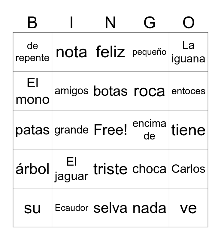 This bingo card has a free space and 37 words: camina, tiene gases, corre, amigos, Carlos, El jaguar, botas, lago, La iguana, El puma, grande, pequeño, ve, tiene, El mono, árbol, plantas, feliz, triste, encima de, de repente, entoces, su, selva, agua, nada, nota, dice, hamburguesa, amable, cruel, Ecaudor, patas, patas palmeadas, choca, roca and la cabeza.