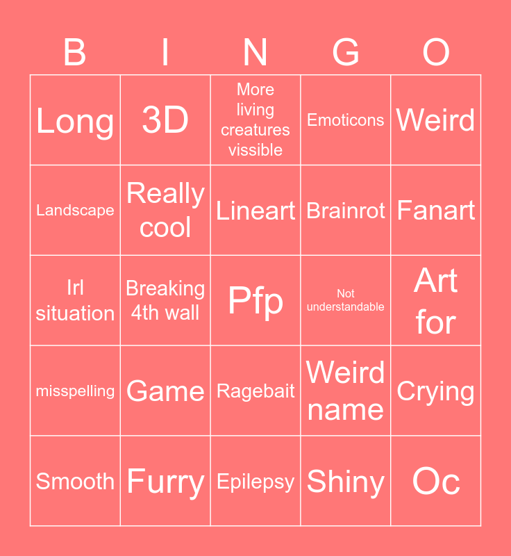 This bingo card has a free space and 24 words: Game, Furry, Lineart, Smooth, Weird, Long, Landscape, 3D, Not understandable, Ragebait, Brainrot, Irl situation, Weird name, Crying, Really cool, Shiny, Art for, More living creatures vissible, Fanart, Breaking 4th wall, Oc, misspelling, Emoticons and Epilepsy.
