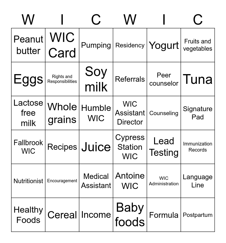 This bingo card has 82 words: Food package, Breastfeeding, Pumping, Women, Infant, Child, Postpartum, Pregnant, Formula, Whole milk, Low fat milk, Cheese, Eggs, Whole grains, Beans, Peanut butter, Juice, Fruits and vegetables, Baby cereal, Cereal, Baby foods, Soy milk, Lactose free milk, Yogurt, Tuna, Lab, Height and weight, Hemoglobin Testing, Iron, Intake, Counseling, Clerk, Peer counselor, Nutritionist, Medical Assistant, Lead Testing, Trainer, Outreach, Referrals, Language Line, Income, Residency, Identification, Register to Vote, Nutrition Notes, WIC Card, myWIC App, Rights and Responsibilities, Inventory, Reports, Antoine WIC, Humble WIC, Cypress Station WIC, Southeast WIC, Baytown WIC, Tomball WIC, Bear Creek WIC, Scarsdale WIC, Emerald Plaza WIC, Fallbrook WIC, Call Center, WIC Director, WIC Assistant Director, WIC Administration, Registered Dietitian, Lactation Consultant, IPA, State Audit, Supervisor, Civil Rights, Hospitality, Card Reader, Signature Pad, Immunization Records, Harris County Public Health, Eligible, Healthy Foods, Nutrition Education, Encouragement, Support, Recipes and Classes.