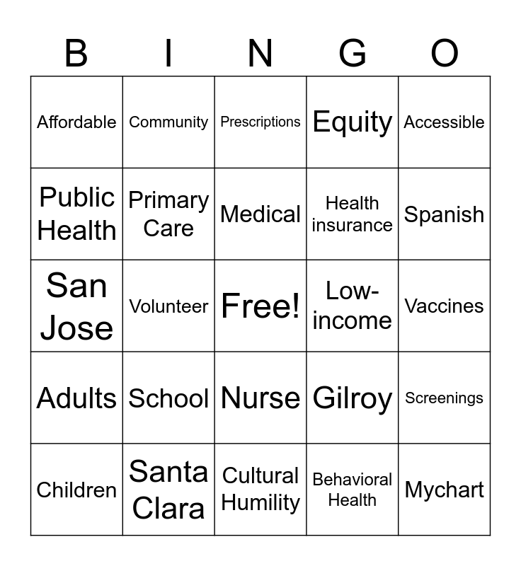This bingo card has a free space and 24 words: School, Santa Clara, Medical, Children, Accessible, Affordable, Public Health, Community, Low-income, Nurse, Health insurance, San Jose, Gilroy, Screenings, Primary Care, Behavioral Health, Vaccines, Prescriptions, Spanish, Volunteer, Mychart, Adults, Equity and Cultural Humility.
