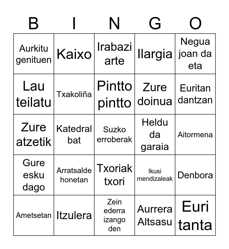This bingo card has 41 words: Free!, Zure atzetik, Sarri sarri, Txakoliña, Itzulera, Txoriak txori, Pintto pintto, Begi bi lore, Negua joan da eta, Gure esku dago, Katedral bat, Ilargia, Suzko erroberak, Aitormena, Heldu da garaia, Arratsalde honetan, Erre zenituzten, Aurkitu genituen, Furra furra, Irabazi arte, Denbora, Euri tanta, Zein ederra izango den, Zure doinua, Aldapan gora, Kantu bat, Aurrera Altsasu, Xorieri, Euritan dantzan, Enarak, Maite zaitut, Kaixo, Ametsetan, Lau korapilo, Ikusi mendizaleak, Lau teilatu, Txanpon baten truke, Paradisu zinema, Aukera berriak, Porru patata and Egunero.
