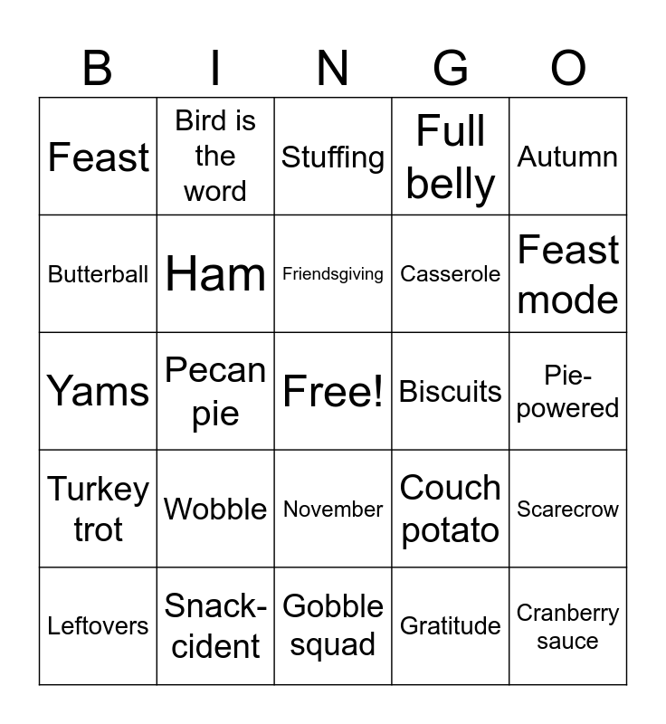 This bingo card has a free space and 83 words: Turkey, Gravy, Stuffing, Mashed potatoes, Cranberries, Pumpkin pie, Apple pie, Sweet potatoes, Green bean casserole, Dinner roll, Cornbread, Mac & cheese, Ham, Biscuits, Harvest, Feast, Leftovers, Butterball, Drumstick, Turkey breast, Roasted veggies, Casserole, Cranberry sauce, Sweet corn, Pecan pie, Whipped cream, Hot cider, Hot cocoa, Turkey gravy boat, Gobble, Wobble, Wishbone, Cran-Jam, Yams, Pie-coma, Food baby, Gobble squad, Stuffed, Feast mode, Turkey trot, Tryptophan, Gobble gobble, Leftover lover, Mashed-tato mood, Snack attack, Turkey time, Bird is the word, Waddle, Buttered up, Corny, Couch potato, Full belly, Pie-powered, Cozy mode, All the fixin’s, Carb-loading, Feast beast, Sauce boss, Snack-cident, Second helpings, Spoonful, Turkey vibes, Tater time, Autumn, Leaves, Scarecrow, Cozy, Fall vibes, Sweater weather, Gourd, Pumpkin, Cornucopia, Acorn, November, Gratitude, Thankful, Family, Friendsgiving, Parade, Football, Nap, Warmth and Comfort food.