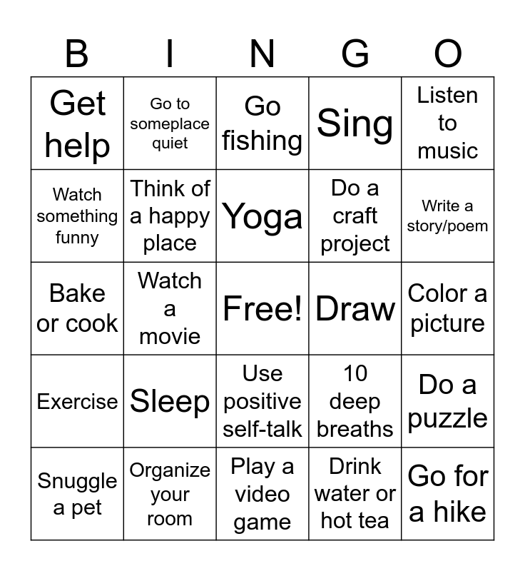 This bingo card has a free space and 36 words: Go for a walk, Read, Walk Away, Think of a happy place, 10 deep breaths, Exercise, Yoga, Eat something healthy, Listen to music, Talk with a friend, Watch a movie, Sing, Stress ball, Draw, Write a story/poem, Get help, Play a game, Sleep, Go for a hike, Go fishing, Color a picture, Do a puzzle, Organize your room, Snuggle a pet, Play a video game, Go to someplace quiet, Bake or cook, Do a wordsearch puzzle, Do a craft project, Watch something funny, Tell a joke, Take a shower, Drink water or hot tea, Use positive self-talk, Meditation and Write a letter.
