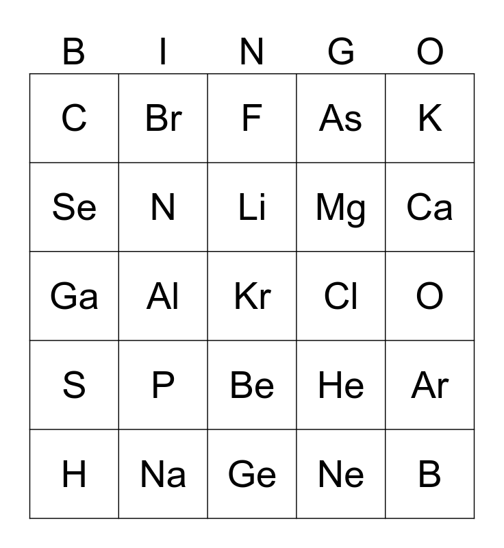 This bingo card has a free space and 24 words: P, Na, Li, H, K, C, Se, Br, Cl, Be, Mg, Ga, He, Ar, N, Ne, O, F, Ca, Al, B, S, As and Ge.