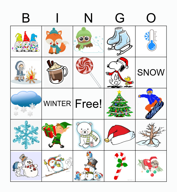 This bingo card has 49 images, a free space and 5 words: WINTER, SNOW, COLD, HOLIDAY and SNOWBALL.