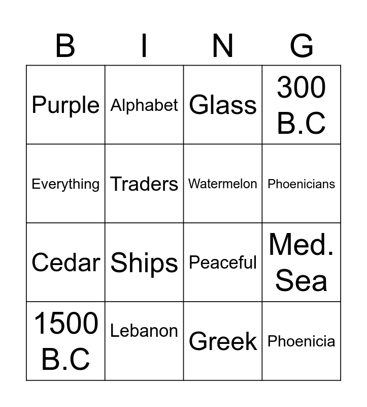 This bingo card has 16 words: Lebanon, Med. Sea, Glass, Purple, Cedar, Alphabet, Peaceful, Greek, Everything, Traders, 1500 B.C, 300 B.C, Ships, Phoenicians, Watermelon and Phoenicia.