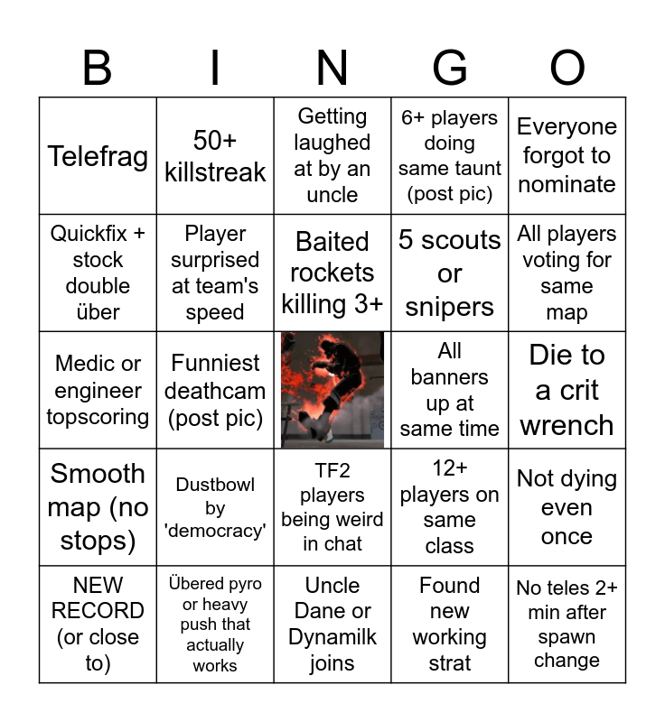 This bingo card has a free space and 24 words: Dustbowl by 'democracy', Übered pyro or heavy push that actually works, Baited rockets killing 3+, NEW RECORD (or close to), Everyone forgot to nominate, Telefrag, Quickfix + stock double über, 50+ killstreak, All banners up at same time, TF2 players being weird in chat, 5 scouts or snipers, Medic or engineer topscoring, 12+ players on same class, Not dying even once, Player surprised at team's speed, Found new working strat, Die to a crit wrench, Getting laughed at by an uncle, All players voting for same map, Funniest deathcam (post pic), No teles 2+ min after spawn change, Smooth map (no stops), 6+ players doing same taunt (post pic) and Uncle Dane or Dynamilk joins.