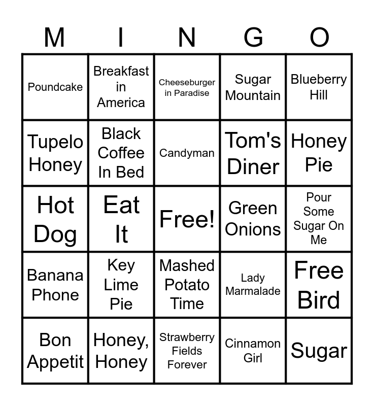 This bingo card has a free space and 34 words: Red, Red Wine, Cinnamon Girl, American Pie, Apple, Peaches Pumpkin Pie, Banana Phone, Black Coffee In Bed, Blueberry Hill, Bon Appetit, Breakfast in America, Cake By The Ocean, Candyman, Cheeseburger in Paradise, Cherry Pie, Dixie Chicken, Green Onions, Honey Pie, Honey, Honey, Hot Dog, Key Lime Pie, Lady Marmalade, Mashed Potato Time, Peaches & Cream, Poundcake, Pour Some Sugar On Me, Strawberry Fields Forever, Sugar, Sugar Mountain, Sugar, Sugar, Tom's Diner, Tupelo Honey, Tutti Frutti, Eat It, Free Bird and Harvest Moon.