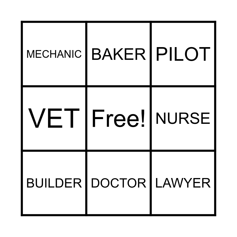 This bingo card has a free space and 8 words: NURSE, PILOT, BAKER, BUILDER, MECHANIC, LAWYER, VET and DOCTOR.