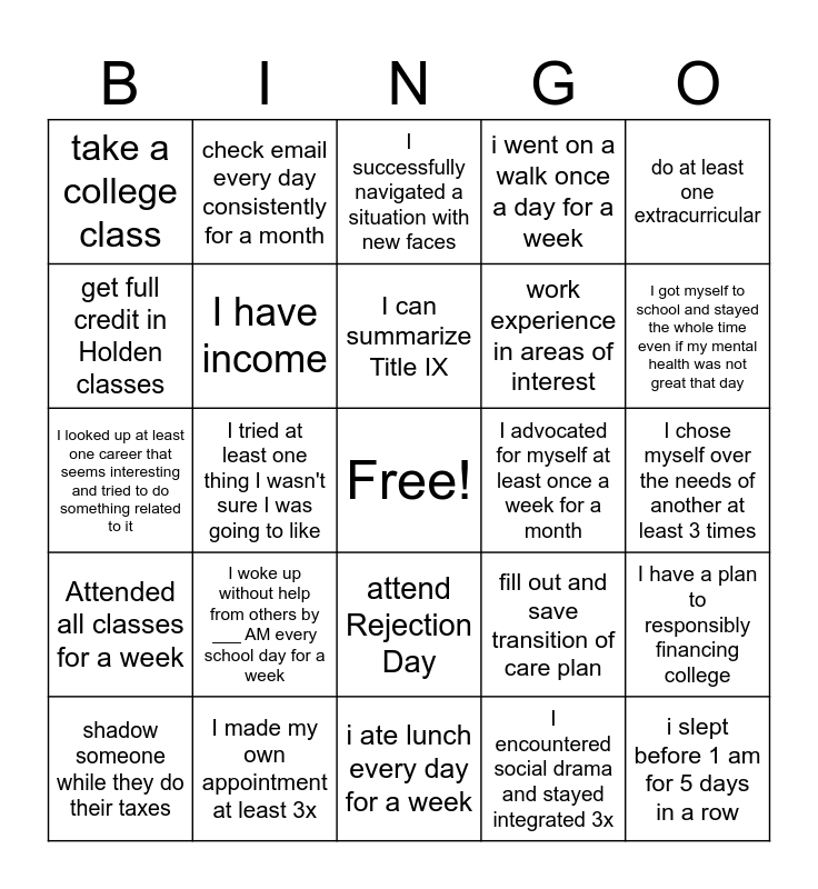 This bingo card has a free space and 24 words: I woke up without help from others by ___ AM every school day for a week, I made my own appointment at least 3x, I can summarize Title IX, shadow someone while they do their taxes, do at least one extracurricular, take a college class, get full credit in Holden classes, check email every day consistently for a month, I advocated for myself at least once a week for a month, attend Rejection Day, work experience in areas of interest, I looked up at least one career that seems interesting and tried to do something related to it, fill out and save transition of care plan, I have a plan to responsibly financing college, I have income, I encountered social drama and stayed integrated 3x, I chose myself over the needs of another at least 3 times, I successfully navigated a situation with new faces, I got myself to school and stayed the whole time even if my mental health was not great that day, I tried at least one thing I wasn't sure I was going to like, i slept before 1 am for 5 days in a row, Attended all classes for a week, i went on a walk once a day for a week and i ate lunch every day for a week.