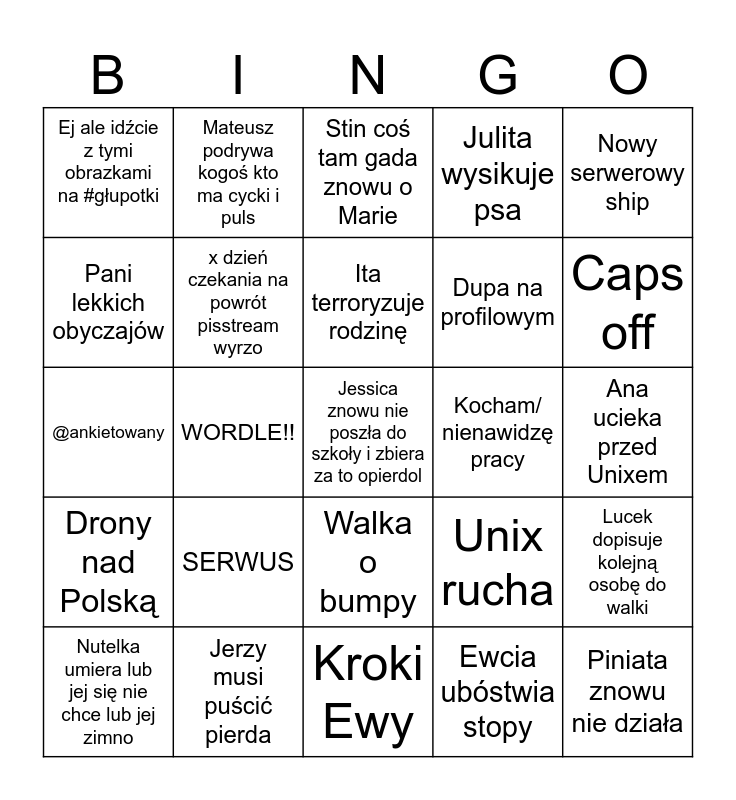 This bingo card has a free space and 24 words: SERWUS, Jerzy musi puścić pierda, Ita terroryzuje rodzinę, Nutelka umiera lub jej się nie chce lub jej zimno, Nowy serwerowy ship, Ej ale idźcie z tymi obrazkami na #głupotki, Pani lekkich obyczajów, Mateusz podrywa kogoś kto ma cycki i puls, Kocham/ nienawidzę pracy, Walka o bumpy, Dupa na profilowym, @ankietowany, Unix rucha, Lucek dopisuje kolejną osobę do walki, x dzień czekania na powrót pisstream wyrzo, Ewcia ubóstwia stopy, Ana ucieka przed Unixem, Stin coś tam gada znowu o Marie, Caps off, WORDLE!!, Piniata znowu nie działa, Drony nad Polską, Julita wysikuje psa and Kroki Ewy.